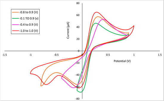 The additional negative potential contributes to a greater extent to the redox process, thereby increasing the peak current. However, the increase is moderate, indicating that the potential extension to −0.4 V is still within the optimal electrochemical window for the system without causing significant side reactions or capacitive current increases. In the case of the potential range of −0.8 to 0.9 V, the peak current further increases compared to the −0.4 to 0.9 V range. This suggests that the diffusion-limited region’s contribution is more pronounced, enhancing the electron transfer kinetics. However, the peak becomes broader, which can be attributed to increased capacitive currents at the more negative potential, adding to the background noise and potentially obscuring some faradaic processes. The broader peak also suggests a slight shift in the reversibility of the redox reaction, indicating slower kinetics at these extreme potentials.