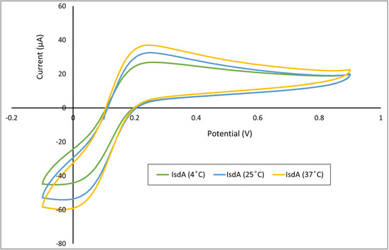 Figure 6. CV curves for analyzing the temperature effect on IsdA (5 μM) detection by the aptasensor in the presence of [Fe(CN)6]−3/−4 and 0.1 M KCl at pH 7.5, at three different temperatures (37 °C, 25 °C, 4 °C).
