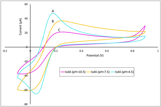 Figure 7. CV curves for analyzing the pH effect on IsdA (5 μM) detection by the aptasensor in the presence of [Fe(CN)6]−3/−4 and 0.1 M KCl. (A) is the IsdA-aptamer complex at pH = 4.5, (B) is the IsdA-aptamer complex at pH = 7.5, and (C) is the IsdA-aptamer complex at pH = 10.5.