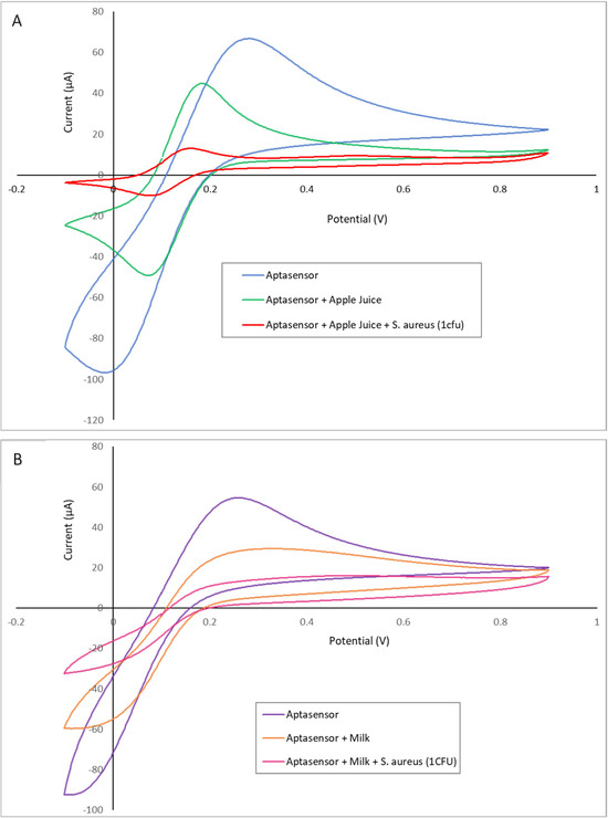 Figure 8. CV curves for the detection of S. aureus in real samples by the aptasensor in the presence of [Fe(CN)6]−3/−4 and 0.1 M KCl. (A) is CV for apple juice, and (B) is CV for milk. Experiments were conducted using 1 CFU/mL of S. aureus at room temperature.