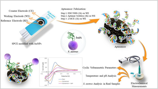 Our work focuses on the development and parametric characterization of an electrochemical aptasensor to detect S. aureus IsdA. The aptasensor utilizes SPCE modified with AuNPs to enhance the surface area and conductivity for aptamer immobilization. AuNPs play a vital role in improving the sensing performance by providing a high surface-to-volume ratio, facilitating aptamer binding, and enhancing electron transfer kinetics [33,34]. The combination of AuNPs and SPCE is intended to achieve high sensitivity and specificity, making it suitable for detecting S. aureus. To address existing gaps in the field, we investigate the optimization of critical parameters such as pH, scan rate, potential range, and aptamer concentration to maximize the performance of the aptasensor. CV was employed as the main analytical tool to study these parameters, ensuring optimal signal output and target binding efficiency. Previous studies have demonstrated the potential of aptasensors for pathogen detection, but many lack detailed parametric studies to create optimized target detection systems [15,35,36,37]. This work builds upon existing research by incorporating CV parametric analyses to optimize performance and validate the aptasensor for S. aureus detection in real food substances (Scheme 1).