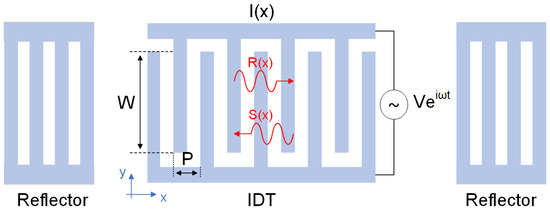 The coupling-of-model (COM) model is the mainstream simulation approach for investigating the performance of SAW devices, which is accurate and efficient [20]. A classic structure of a one-port SAW resonator is shown in Figure 1, where W and P is the aperture and the pitch of grating, respectively.