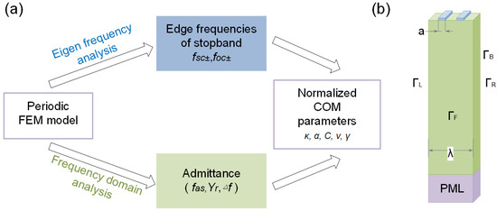 As the COM model is a phenomenological model, the extracted parameters should be as accurate as possible to ensure reliable simulation results of SAW devices [23]. Here, the finite element method (FEM) software COMSOL Multiphysics 6.0 was used to simulate and calculate the extracted parameters for the COM model precisely [24,25]. The specific process is shown in Figure 2a, Since the IDT structure used in SAW devices has some periodicity, in order to save calculation time, only one transduction period structure was taken for simulation. As shown in Figure 2b, periodic boundary conditions were set on the left (ΓL), right (ΓR), front (ΓF), and back (ΓB) of the model, and a perfectly match layer (PML) was added to reduce the reflection from the bottom. In this paper, the metallization ratio () was set to 0.5, so the width of electrode a is λ/4.