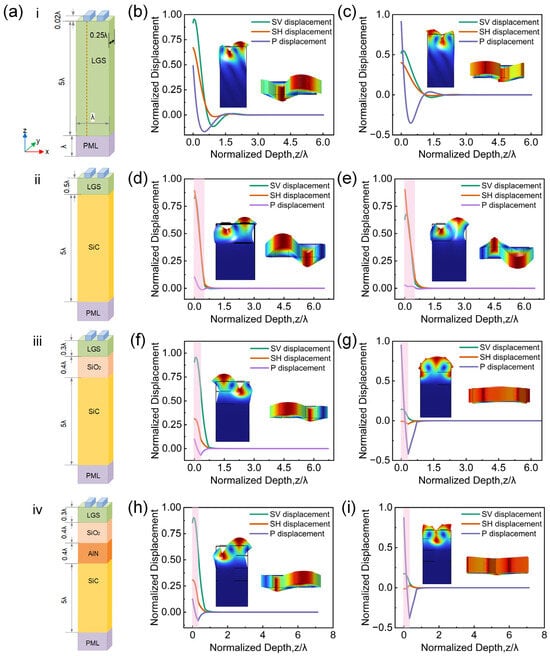 Furthermore, an additional high-temperature-resistant dielectric layer, AlN, was introduced between the SiO2 and SiC layers, forming a four-layer HAL structure as shown in Figure 3(aiv). As shown in Figure 3h,i at 425.55 MHz and 421.43 MHz, the vibration mode and displacement components are nearly identical to those in the three-layer structure, which confined within ~0.9 wavelengths, suggesting that the energy confinement in the four-layer structure is similar to that in the three-layer structure.