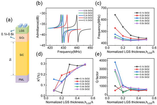 In Section 2.2, the frequency analysis on the three-layer structure with SiO2 as the intermediate layer have already been performed. The results show that this structure offers high energy confinement and clearly distinguishable acoustic modes. A more detailed study of the performance for this structure will now be proceeded with. The electrode thickness is still set to 0.02λ. Other structure parameters are shown in Figure 4a. As shown in Figure 4c, the HAL structure has a certain effect on influencing the device frequency. Generally, with the increase in LGS thickness, the resonance frequency experiences a decreasing trend. Additionally, as the SiO2 thickness increases from 0.1λ to 0.5λ, the frequency also decreases and eventually stabilized with 0.5λ SiO2 thickness. Different with the frequency behavior, as shown in Figure 4d, when the thickness of LGS increases, the electromechanical coupling coefficient K2 also increases. In contrast, changes in the thickness of SiO2 have little effect on K2. It should be noted that fluctuations can be observed when the SiO2 thickness is relatively small, which is due to the enhancement of acoustic-wave-modes coupling when the piezoelectric layer is in close proximity to the high velocity layer SiC, and this fluctuation will be stable after the thickness is larger than 0.4λ.