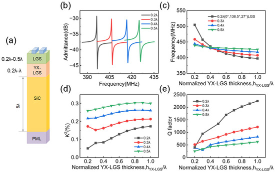 Therefore, YX-cut LGS was selected as the intermediate-layer material for structural optimization as shown in Figure 5a. Subsequently, as shown in Figure 5b, when the YX-LGS thickness is λ, the admittance spectrum has no spurious peaks, and it can be clearly seen that with the increase in the thickness of the first LGS layer, the amplitude of admittance is gradually decreasing and the distance between the resonance frequency and anti-resonance frequency is increasing, which represents the change in K2. The two layers of LGS with different orientations jointly affect the frequency. As shown in Figure 5c, when the thickness of (0°,138.5°,27°) LGS is less than 0.2λ, the frequency decreases with the increasing thickness of YX-cut LGS and then stabilizes after reaching a certain thickness. However, when the (0°,138.5°,27°) LGS thickness exceeds 0.2λ, the influence of the YX-cut LGS thickness on the frequency decrease becomes gradual, and when the (0°,138.5°,27°) LGS layer thickness reaches 0.5λ, the effect of changing the YX-cut LGS thickness on the frequency becomes negligible. Similar to that behavior, as shown in Figure 5d, as the thickness of the YX-cut LGS increases, K2 gradually increases. Moreover, a thicker (0°,138.5°,27°) LGS layer results in a larger K2. However, a thicker (0°,138.5°,27°) LGS layer results in a smaller Q factor, as shown in Figure 5e. As the thickness of the YX-cut LGS increases, the Q factor also increases. However, as the thickness of the first LGS layer increases, the influence of changes in the YX-cut LGS thickness on the Q factor diminishes, and the Q factor gradually stabilizes. Therefore, in Figure 5e, a trade-off must be considered when choosing a proper thickness of (0°,138.5°,27°) LGS layer.