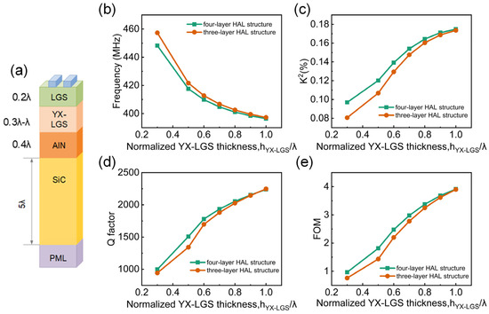 (a) FEM Simulation model diagram of the four-layer HAL structure. Comparison of (b) frequency, (c) K2, (d) Q factor, and (e) FOM between three-layer and four-layer HAL structures with varied thickness of YX-LGS.