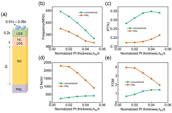 (a) FEM simulation model diagram of the three-layer HAL structure with varying electrode thickness. Comparison of (b) frequency, (c) K2, (d) Q factor and (e) FOM from the conventional and HAL structure SAW devices with varied Pt electrode thicknesses.