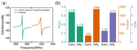 The comparison of (a) admittance spectrum and (b) performance parameters between optimized HAL and conventional structure SAW devices.