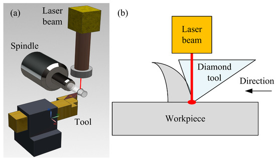 In traditional laser-assisted cutting technology, the laser source is directly aimed at the surface of the workpiece and emitted, utilizing the preheating effect of the laser to reduce the surface hardness of the material and achieve the ultra-precision machining of difficult-to-machine materials. This laser-assisted cutting device usually consists of a machine tool and a laser module. The laser beam is irradiated onto the area to be cut, and the workpiece is softened by heating to a specific temperature. Then, the machine tool completes the cutting process, as shown in Figure 2a [28]. Traditional LAC technology changes the cutting performance of materials by directly irradiating the surface of workpieces with lasers, thereby improving the surface quality and machining accuracy of workpieces to a certain extent. However, it also has some shortcomings: firstly, the distance between the laser spot and the tool is relatively large, reaching centimeter level. In order to achieve a softening effect on the workpiece, a large laser power is required, resulting in high energy consumption. Secondly, cutting fluid plays a difficult role in the cutting process because it may interfere with the laser path and increase the uncertainty of the laser focus position. Finally, due to a certain gap between the laser spot and the tool, machining the center position of the workpiece becomes impossible. In response to these issues, scholars have proposed in situ LAC technology, which allows the laser beam to penetrate the tool body and focus on the cutting position. Through the coupling effect between the laser and the tool, in situ heating of the workpiece material is achieved, making the temperature in the processing area precise and controllable, cleverly solving the technical challenges faced by traditional LAC. This processing principle is shown in Figure 2b [29].