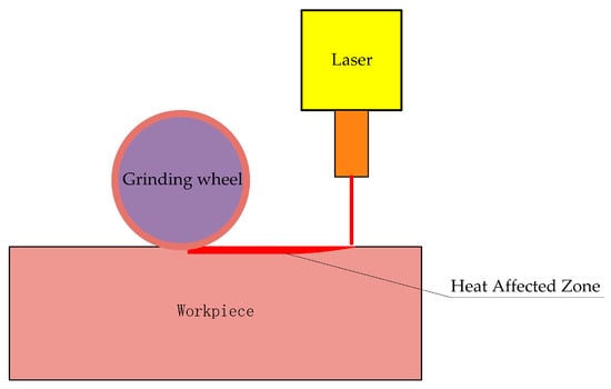 Laser-assisted grinding (LAG) is an innovative manufacturing technology that combines laser technology and traditional grinding processes. The core of this technology is to first preheat the material surface through a high-energy laser beam, aiming to reduce the hardness of the material and remove surface defects. Then, fine machining is carried out using grinding tools; the machining principle is shown in Figure 4. The laser beam acts on the surface of the material at high temperature, rapidly heating up to a softened or evaporated state, effectively reducing friction and wear during the grinding process, thereby improving processing efficiency. The accurate control of key parameters such as laser beam power, focusing position, and movement speed is crucial in the laser-assisted grinding process to ensure the reliability of machining quality. The preheating effect of the laser beam significantly reduces the contact stress between the grinding tool and the material, lowers the grinding force, reduces the accumulation of heat, and effectively avoids the risk of material surface burns and deformation. In addition, laser-assisted grinding technology can improve the material removal rate and shorten the processing cycle, thereby enhancing processing accuracy and surface quality, bringing revolutionary progress to the field of high-precision manufacturing.