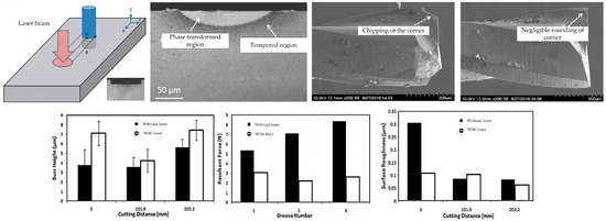 (a–d) Comparison of machining quality data between conventional grinding and laser-assisted grinding [41].