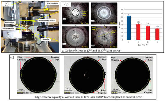 (a–c) Comparison of machining quality data between conventional drilling and laser-assisted drilling [63].