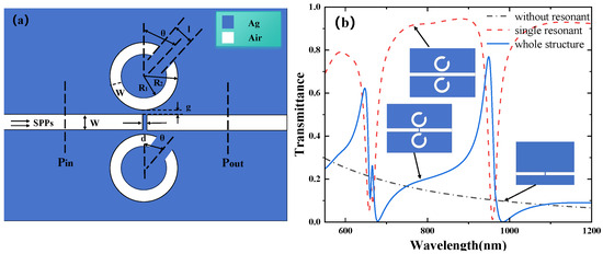 (a) Two-dimensional schematic of an MIM waveguide with the double CSRRCs; (b) finite element method (FEM) calculations of transmission spectra of the overall structure, no resonant cavity, and a single resonant cavity.