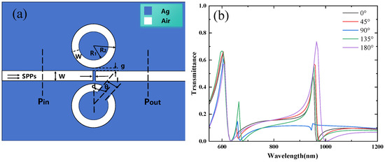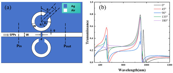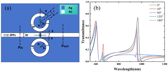 (a) Two-dimensional schematic of the MIM waveguide for Resonator 1 and Resonator 2; (b) finite element method (FEM) calculation of the transmission spectrum for rotating Resonator 1 and fixing Resonator 2.