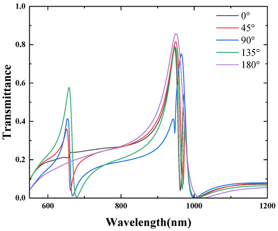 Since the structure is symmetric with respect to the x-axis, when analyzing the effect of a single rotation angle on the structure, Resonator 1 is kept fixed while the rotation angle of Resonator 2 is varied. The parameters remain unchanged: nm, nm, nm, nm, and an initial rotation angle . The rotation angle is incrementally varied clockwise from to , , , and . Figure 10 shows the transmission spectra for Resonator 2 rotated from to . When compared with the transmission spectra in Figure 8b, the overall trend of the curves remains nearly unchanged. Notably, a fourth resonance peak appears at and . At , the second resonance peak disappears. This disappearance is attributed to the x-axis symmetry of the CSRRCs, which results in the vanishing of the second resonance peak that arises from the asymmetric mode.