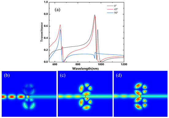 The effects of simultaneously rotating both Resonators 1 and 2 on the structure are discussed below. Since the structure is symmetric with respect to the x-axis, it is sufficient to consider rotation angles of , , and . The structure is depicted in Figure 11a, with the following unchanged parameters: nm, nm, nm, nm, and . The rotation angle is varied in a clockwise direction, with values of , , and . Figure 11a shows the transmission spectra for the simultaneous rotation of both Resonators 1 and 2 and Figure 11b–d show the magnetic field distribution of the structure at , , and . The first resonance peak increases in intensity due to changes in asymmetry, and a new second resonance peak appears at the center when . When , the transmission rate of the structure is higher, making it easier to observe. Therefore, this study focuses on analyzing the structure with an orientation angle of .