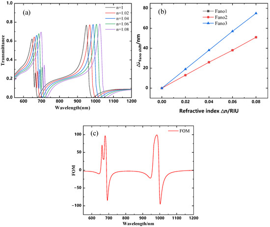 (a) Transmission spectra of the sensor at different refractive indices n; (b) fitted line graph of peak shift () varying with the refractive index (); (c) FOM values corresponding to each resonance peak.