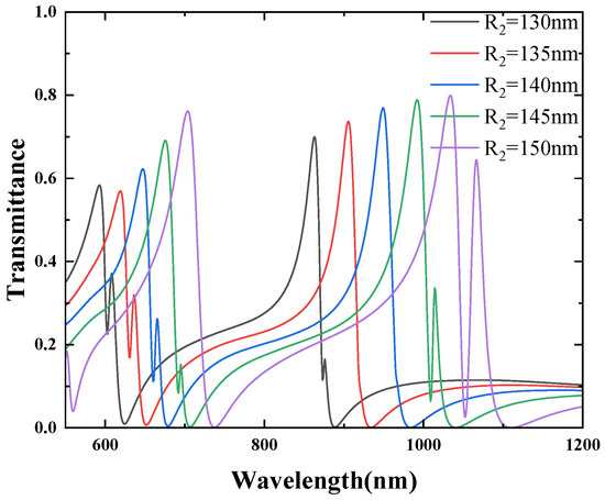 In general, the transmission characteristics of MIM waveguide structures are influenced by changes in their structural parameters. In this study, Fano resonance is generated due to the coupling between the MIM stub and the double CSRRCs. As a result, the peak intensity and line shape of the Fano resonance are affected by the structural geometric parameters. We further investigated the impact of geometric parameters on Fano resonance. The values of these geometrical parameters are the result of optimization, choosing the geometrical parameters associated with the highest transmittance and also with reference to previous research in [30]. Firstly, the other parameters of the waveguide structure were fixed as nm, nm, nm, and nm, while the outer radius of the CSRRC was increased from 130 nm to 150 nm in increments of 5 nm. The influence of this single variable on the Fano resonance was then studied. The transmission spectra of the structure for different values of the outer radius are shown in Figure 13. As increases, all three Fano resonance peaks exhibit a noticeable redshift, indicating that the resonance wavelength of the Fano peaks is determined by the narrow-band discrete states. The increase in results in a shift in the resonance wavelengths in the narrow-band spectrum, which ultimately causes the redshift of the Fano resonance.