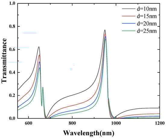 Additionally, the effect of the silver stub width on the transmission spectra was investigated. The stub width d was varied between 10 nm and 25 nm in increments of 5 nm, while keeping the other parameters unchanged. The corresponding transmission spectra are shown in Figure 14. As observed in this figure, the positions of the Fano resonance peaks remain nearly unchanged. However, the first and third Fano resonance peaks gradually decrease in intensity with increasing d, while the second Fano resonance peak remains unaffected. This behavior can be attributed to the fact that the resonance wavelength is primarily determined by the geometric parameters of the CSRRC. As the stub width d increases, the line shape of the spectrum also changes. This is due to the fact that Fano resonance arises from the interaction between a broad-band continuum state and a narrow-band discrete state. As the stub width increases, the wide continuous spectrum generated by the stub in the MIM waveguide changes, which in turn affects the shape of the Fano resonance curve. For the effect of d and R, it that seems the transmission rate of each Fano resonance peak slightly changes. The radius increases from 130 nm to 150 nm in increments of 5 nm, and each corresponds to an FOM of 98.5, 98.70, 99.17, 99.54, and 99.10, respectively. The d increases from 10 nm to 25 nm in increments of 5 nm, and each d corresponds to an FOM of 99.17, 99.06, 98.8, and 99.04, respectively, The effect of these parameters on FOM is small and almost unchanged.