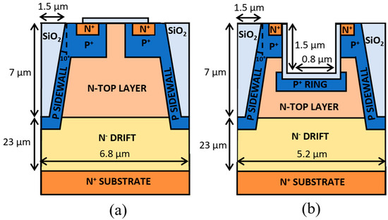 Firstly, a planar channel semi-superjunction design with a tilted oxide trench (see Figure 1) is simulated, focusing on optimizing the SSJ effect while minimizing charge imbalance. To further exploit the SSJ effect, a TSSJ design is considered, incorporating a trench gate that is 0.8 µm wide and 1.5 µm deep. The absence of a JFET region in this design allows for a reduced cell pitch of 5.2 µm. Additionally, a p-ring with a high doping concentration of 5 × 1018 cm−3 is added at the bottom of the trench to shield the gate oxide from excessive electric fields, enhancing device reliability.