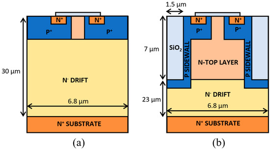 Sketch of the reference devices. (a) Planar (benchmark). (b) Vertical semi-superjunction (ideal). Not to scale.