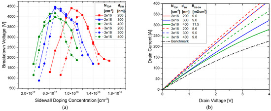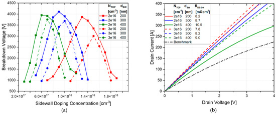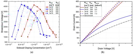 An analysis of its performance was conducted by varying the p-sidewall peak doping concentration and implantation depth (dSW). Variations in the JFET n-top layer doping concentrations of 2 × 1016 cm−3 and 3 × 1016 cm−3, as well as p-sidewall depths of 200 nm to 400 nm, were considered. The resulting behavior of the BV is reported in Figure 4a.