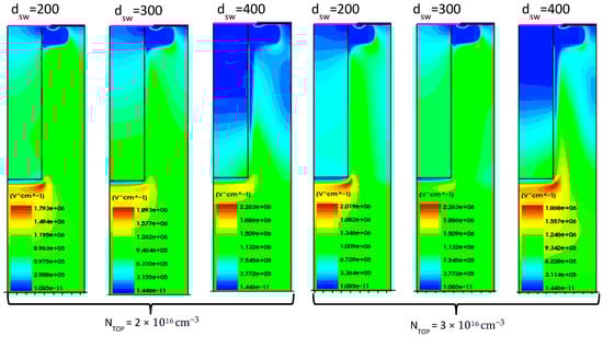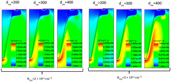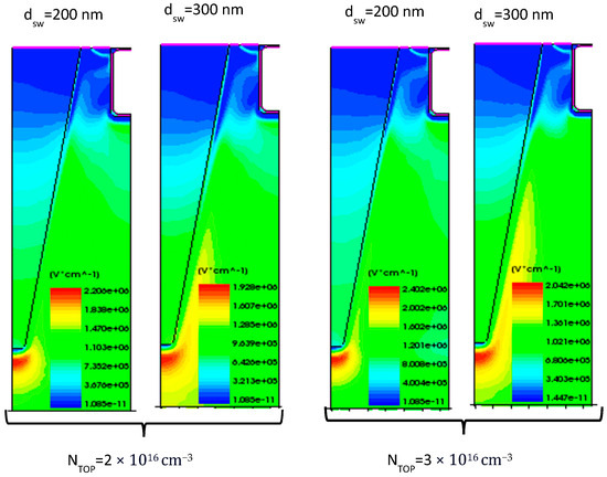 A significant improvement in the on-state conduction was also achieved, with RDS-ON varying from 8.6 mΩ·cm2 to 11.5 mΩ·cm2, ensuring an improvement from 21.7% to 49.8%, as shown in Figure 4b. The on-state characteristics were simulated using the p-sidewall concentration that achieved the optimal charge balance for each combination of N-top layer doping and sidewall depth, according to Figure 4a. In Figure 5, the EF distribution at 2 kV is reported, showing reasonable values for the EF peak value.
