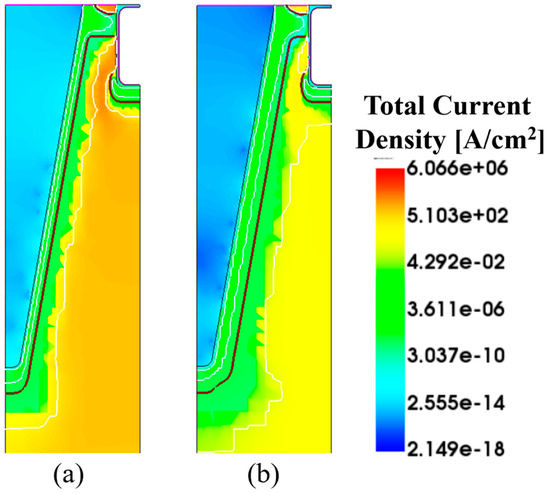 Total current density path for an n-top layer doping concentration of 3 × 1016 cm−3 and (a) dSW = 200 nm; and (b) dSW = 400 nm. In the figure is highlighted the junction line (black lines).