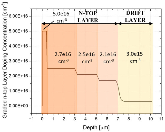 To explore the effectiveness of this graded approach, a simulation was performed on the PSSJ considering a sidewall depth of 300 nm and a peak p-doping concentration of 1 × 1018 cm−3, which were found to be the optimal parameters for the constant n-top layer case. The n-top layer was divided into four sections, with doping concentrations of 5.0 × 1016 cm−3, 2.5 × 1016 cm−3, 2.1 × 1016 cm−3, and 1.7 × 1016 cm−3. The resulting doping profile is reported in Figure 11.