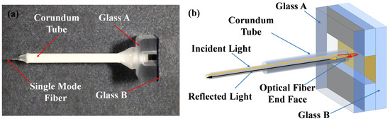 A low-finesse, membrane-free optical fiber F-P acoustic sensor is used for the experiments in this paper, as depicted in Figure 1a. The sensor has a cavity length of approximately m, and mainly consists of an open cavity and a single-mode optical fiber, as shown in Figure 1b. The cavity is formed by two glass pieces, fixed together by spacers that are insensitive to temperature and other external environmental factors. The glass A, glass B, and spacers are made of ULE (ultra-Low expansion) glass, which consists of silicon dioxide () and titanium dioxide (), and has a coefficient of thermal expansion that is close to zero—within the range of 0 to 50 °C. The glass B was given a surface treatment. This property allows it to maintain extremely high dimensional stability during temperature fluctuations. In addition, ULE glass has low thermal conductivity and excellent mechanical strength, making it suitable for use in high-precision optical components. The cavity length therefore hardly changes during the full duration of the 20 °C experiment. The single-mode fiber is threaded through a hole reserved in the middle of glass A, and its end face forms an F-P interferometric structure with the inner surface of glass B. This cavity is used to sensitize refractive index changes. A monochromatic laser is injected into a single-mode fiber and reflected at the fiber end face and glass B, respectively. Since the reflectivity of glass B is relatively low, the interference in this F-P cavity can be approximated as two-beam interference.
