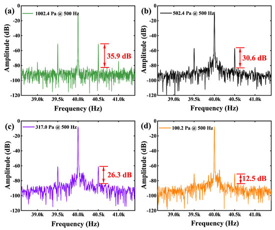 Before processing the interference signal , we analyze the interference spectra at a 20 kHz laser modulation frequency when the acoustic signal frequency is fixed at 500 Hz with sound pressures of 1002.4 Pa, 502.4 Pa, 317.0 Pa, and 100.2 Pa applied, respectively. Figure 3 illustrates the amplitude of the acoustic signal components in the second harmonic sideband of the interference spectrum under different sound pressures. It can be observed that as the sound pressure decreases, the amplitude of the acoustic signal components also diminishes. When the sound pressure drops below a certain threshold, effective acoustic signals can no longer be extracted using the traditional mixing method.