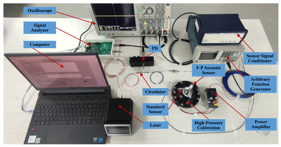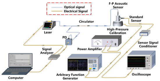 In order to verify the demodulation performance of this demodulation algorithm for the membrane-free F-P acoustic sensor under high sound pressure, we construct a demodulation system, as shown in Figure 4. The system employs a DBF laser (DBF1550P, Thorlabs, Newton, NJ, USA) with a central wavelength of 1550 nm, a tunable range of 4.5 nm, and a linewidth of 150 kHz. The laser is driven by a compact laser controller (CLD1015, Thorlabs), which has a maximum current modulation frequency of 250 kHz and therefore a wide range of sound bands that can be demodulated. This experimental system uses a standard electroacoustic sensor (378C01, PCB, Depew, NY, USA) for the calibration of sound pressure levels. The sound pressure information of the standard electroacoustic sensor is output as an electrical signal to an oscilloscope for display using the sensor signal conditioner (482C, PCB). The sound source uses a high sound pressure calibrator. A standard sine signal generated by the Arbitrary Function Generator (31102, Tektronix, Beaverton, OR, USA) is amplified by a power amplifier to drive the calibrator. The maximum sound pressure level that this high-pressure calibration can achieve is 164 dB. A PD (2117, NEW Focus, San Jose, CA, USA) is used to convert the interfering light intensity of the F-P sensor into voltage signals. The signal analyzer captures the voltage signal and simultaneously generates the modulation signal for the laser. Since the laser allows modulation frequencies up to 250 kHz, we opted for internal modulation to reduce system complexity.