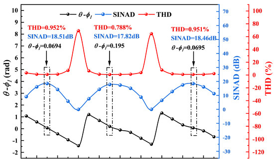 To validate the demodulation performance of the proposed PGC algorithm for membrane-free acoustic sensors, we construct experiments using the system depicted in Figure 5. A sinusoidal electrical signal generated by the signal analyzer is used to modulate the laser. As analyzed above, the traditional PGC algorithm introduces a carrier phase delay of and a mixing phase error of . In order to assess the impact of the phase error caused by these two parts on the acoustic signal demodulation results, the impact of the total delay error on the demodulation results, including THD and SINAD, is analyzed by adjusting the phase of the mixing signal. This mixing signal is generated by the DDS module of the signal analyzer. Based on the experimental results, the variation of is calculated by applying Equation (9). Then, the SINAD and THD of the demodulated acoustic signal are analyzed, as illustrated in Figure 6. Phase shifts in the mixing signals lead to changes in the within the range of . When approaches , the SINAD of the demodulated acoustic signal reaches its minimum, while THD increases and signal distortion becomes severe. With approaching zero, the acoustic signal achieves minimal THD and maximal SINAD, and demonstrates that the change is cyclical. Therefore, we adjust the phase of the mixing signal to optimize THD and SINAD in the acoustic demodulation results before proceeding with the subsequent experiments.