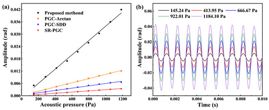 Subsequently, we conduct sensitivity experiments on the membrane-free F-P acoustic sensor using the proposed PGC algorithm. Sensitivity is a key measure of the responsiveness of the entire demodulation system to sound pressure. Initially, a standard sinusoidal signal with a fixed frequency of 1 kHz is generated by the AFG. After passing through a power amplifier, this signal was utilized to drive the high sound pressure calibrator. By adjusting the amplitude of the sinusoidal signal, the output sound pressure level of the high sound pressure calibrator can be effectively controlled. On the other hand, a calibrated standard electroacoustic sensor is utilized to obtain accurate sound pressure values. Figure 7a shows the relationship between the amplitude of the acoustic signal and the sound pressure. It can be observed that the slope of the linear fit curve of the improved PGC algorithm is , i.e., the demodulation sensitivity of the algorithm is rad/Pa. The linear fit of is 0.9944, indicating excellent linearity of the proposed method. In order to compare the demodulation sensitivity of the proposed improved PGC algorithm with that of traditional PGC algorithms, interference signals at the same modulation depth are demodulated using different algorithms and the results are analyzed, as shown in Figure 7b. The demodulation sensitivities of the conventional PGC-Arctan and PGC-SDD algorithms are rad/Pa and rad/Pa, respectively, while the demodulation sensitivity of the SR-PGC algorithm is only rad/Pa. These results demonstrate that the demodulation sensitivity of the proposed improved PGC algorithm is significantly better than that of the conventional PGC algorithms. Figure 7b illustrates the variation in the demodulated signal amplitude with time for the improved PGC algorithm at sound pressures of 145.24 Pa, 413.95 Pa, 666.67 Pa, 922.01 Pa, and 1184.10 Pa, respectively.