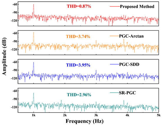 The previously derived Equation (15) indicates that there is no nonlinear error in the proposed method. However, nonlinear distortion features are present in some traditional PGC algorithms like PGC-Arctan. Consequently, we proceed to evaluate the nonlinear distortion characteristics of the demodulated signal generated by the proposed algorithm. As shown in Figure 8, the proposed PGC algorithm achieves a 0.87% THD at 1 kHz and 145.24 Pa. Meanwhile, we compare the THD of the acoustic signal across different PGC demodulation algorithms under the same acoustic conditions. Experimental results indicate that the same raw interfering signals demodulated using the PGC-Arctan, PGC-SDD, and SR-PGC algorithms resulted in THD values of 3.74%, 3.95%, and 2.96%, respectively. All three algorithms exhibit significant harmonic signals at 3 kHz and 4 kHz. Moreover, the amplitude of the signals demodulated by these three methods under the same sound pressure is noticeably lower than that of the proposed method, which is a key factor contributing to the higher harmonic distortion in these methods. Overall, the proposed method demonstrates a slightly lower THD.