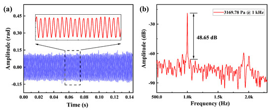 Time-domain waveform (a) and frequency-domain response (b) of the demodulated phase under an acoustic pressure of 3169.78 Pa at 1 kHz.