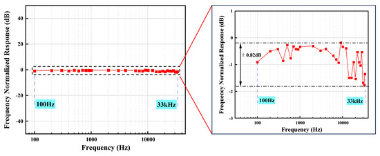 Frequency response is also an important metric in acoustic sensing systems, as it characterizes the range of frequencies to which the system is most sensitive. We test the frequency response of the demodulation system at modulation frequencies up to 200 kHz. Experimental results are depicted in Figure 10, showing that the improved PGC algorithm achieves a frequency response from 100 Hz to 33 kHz with a flatness of ±0.82 dB. In this system, as the modulation frequency increases, not only is there a delay in phase output, but the optical power also experiences varying degrees of attenuation. The amplitude of the optical power will directly affect the demodulation result of the system. This is one of the reasons why higher frequency signals cannot be used for modulation. However, the demodulation system constructed has a good frequency response while maintaining the sensitivity and THD of the demodulation results. In future work, by adjusting the modulation frequency or employing higher-frequency external modulation methods, it may be possible to extend the frequency response of the system.