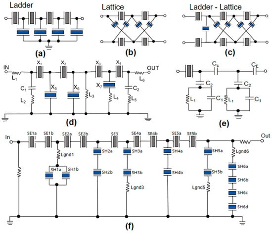 - Shirakawa, A.A.; Pham, J.M.; Jarry, P.; Kerherve, E.; Cathelin, A. A High Isolation and High Selectivity Ladder-Lattice BAW-SMR Filter. In Proceedings of the 2006 European Microwave Conference, Manchester, UK, 13–15 September 2006; pp. 905–908. [Google Scholar]