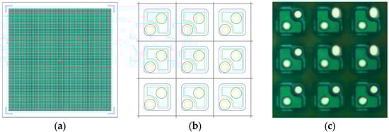 In this work, a GaN 64 × 64 micro LED monolithic display array was bonded onto a passive drive circuit using a flip-chip aligner. The display chip size of the 64 × 64 micro LED array, as shown in Figure 1, was 2016 μm × 2016 μm. The size of the micro LEDs in the display array was 20 μm × 20 μm, and the pitch of the micro LEDs was 28 μm.