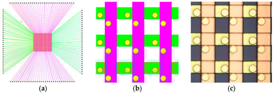 The drive circuit structure is shown in Figure 2, including the high-resistivity Si substrate, the Ti/Au row line for the LED anode, the Ti/Au column line for the LED cathode, and Au pads for the LED P, N electrode connection. As shown in Figure 2a, the P, N electrode lines are extruded to the 100 μm × 100 μm connection pad at the edge of the silicon substrate. In order to save substrate area space and facilitate the gold wire bonding, P-type odd-numbered electrode pads are arranged on the upper boundary of the substrate, and even-numbered P electrode pads are arranged on the lower boundary. Similarly, N-type odd electrode pads are arranged on the left side of the chip, while even N electrodes pads are on the right.
