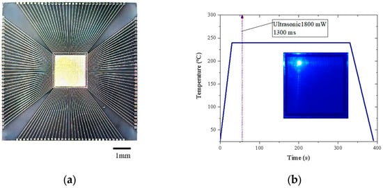 The micro LED display array was fabricated on the Si substrate with integrated drive circuits using a flip-chip bonding method. The fabricated micro LED display array is shown in Figure 3a. This process was completed using a Fineplacer 2000 (Finetech, Berlin, Germany), and the bonding temperature curve is illustrated in Figure 3b. The flip-chip bonding pressure was 15 N, and an 1800 mW ultrasonic power was applied to the bonding chips at 25 s and maintained for 1300 ms.
