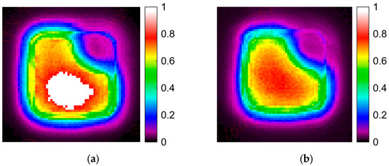 The light emission profile of micro LED display array pixels measured using a laser beam profiler (at a 12.5 A/cm2 current density). (a) Micro LED with diagonal covered by a photonic crystal structure. (b) Micro LED without a photonic crystal structure.