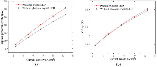 Furthermore, the electroluminescence (EL) characteristics of the micro LED pixels were tested with a Laser Beam Profiler (Zolix, Beijing, China) and a KeithleyTM 4200A-SCS Parameter Analyzer (Tektronix, Beaverton, OR, USA). We compared the half-photonic-crystal-covered micro LED pixel (photonic crystal LED) and the pixel without photonic crystal (without photonic crystal LED). The light output from the photonic crystal LED, under a current bias ranging from 2.5 A/cm2 to 12.5 A/cm2, demonstrated a nearly 15% increase in average output power, as shown in Figure 6. The EL test results prove that the photonic crystal structure can improve the micro LED light extraction efficiency. If photonic, crystal, full-covered micro LED samples were used in EL measurements, the light output power would be further enhanced.