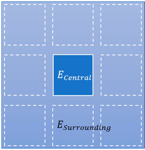 The calculated light power distribution data from a 3 × 3 micro LED array (Figure 8) are processed using Equation (2), and the is derived. Then, the are used to find the cross-correlation between the central LED [1,1] and the other eight surrounding LEDs. The light crosstalk parameter for each LED is shown in Figure 10.