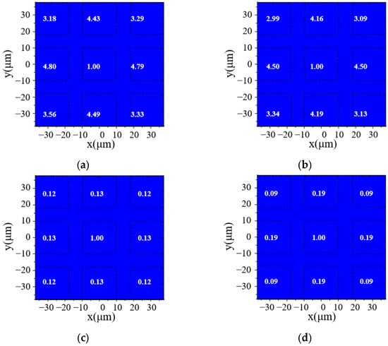 The calculated light crosstalk factor of the central micro LED to the surrounding micro LEDs. (a) 150 μm sapphire substrate micro LEDs without a photonic crystal structure. (b) 150 μm sapphire substrate micro LEDs with a photonic crystal structure. (c) 5 μm sapphire substrate micro LEDs without a photonic crystal structure. (d) 5 μm sapphire substrate micro LEDs with a photonic crystal structure.