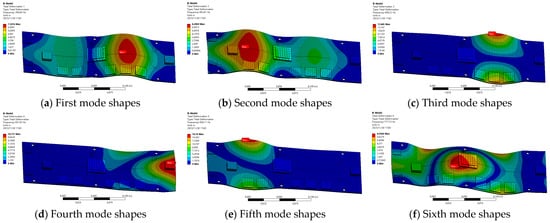 As illustrated in Figure 11, the maximum amplitude of the first six modal vibration patterns is observed on the printed board. The directions of these modal vibration amplitudes are primarily within the x–y plane, with bending deformations occurring predominantly along the z-direction. Notably, the amplitude near the constrained positions is relatively small, whereas it increases significantly away from these constrained areas. Based on the aforementioned analysis, it can be concluded that the primary damage to the printed board assembly stems from vibrational loads acting in the z-direction. Therefore, a judicious selection of the assembly’s layout location can enhance the assembly’s reliability under random vibration conditions.