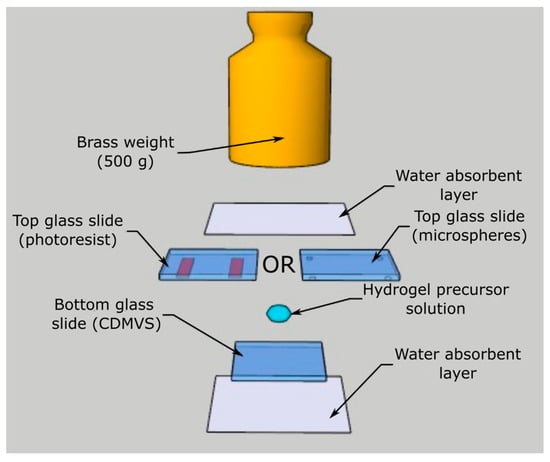 We obtained ~25 × 25 mm top and bottom glass squares used for casting by cutting microscope slides using a diamond scribe. Before use, the glass squares were sonicated for 30 min each in Decon 90 detergent solution, deionized water, and ethanol. Then, they were dried in air. To obtain bottom glass squares for casting, cleaned glass squares were immersed in a 0.2% (v:v) solution of CDMVS in toluene for 30 min, transferred to clean toluene for 5 min, and dried on soft tissue paper. To obtain top glass squares for casting, polystyrene latex beads were deposited on all four corners of clean glass slides by pipetting 1 µL of a 1% (w:v) suspension of beads in water and drying at 60 °C overnight. Alternatively, top glass squares were obtained for casting by spin coating Megaposit SPR220-3.0 photoresist (A-Gas Electronic Materials, Warwickshire, UK) at 7000 rpm for 30 s, exposing it to UV light through a photomask, and immersing it in MF-24A developer to obtain rectangular photoresist spacers on top glass slides, as shown in Figure 1. For beads, based on the size distribution given by the supplier, hydrogel layer thickness was between 1.0 and 1.2 µm. Based on the photoresist datasheet, the thickness of the photoresist spacers was 2.0 ± 0.01 µm.