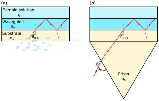 Once N has been determined, Equation (6) gives the resonance angles (θR,int) marked in Figure 3. For a flat substrate, θR,int is complex and hence physically unrealizable. Prism coupling, conducted using a suitable prism placed underneath the substrate, overcomes this limitation []. The external resonance angle θR,ext, which is marked in Figure 3, is given by Equation (7), where ϕ is the angle between the substrate and the prism faces. In this work, an equilateral prism was used, and so ϕ was 60°.
