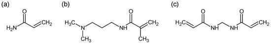 Chemical structures of (a) acrylamide, (b) N-[3-(dimethylamino)propyl]methacrylamide (DMA) monomers, and (c) N, N-methylene bisacrylamide crosslinker.